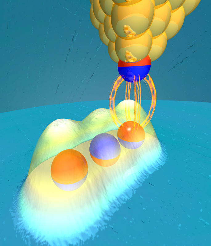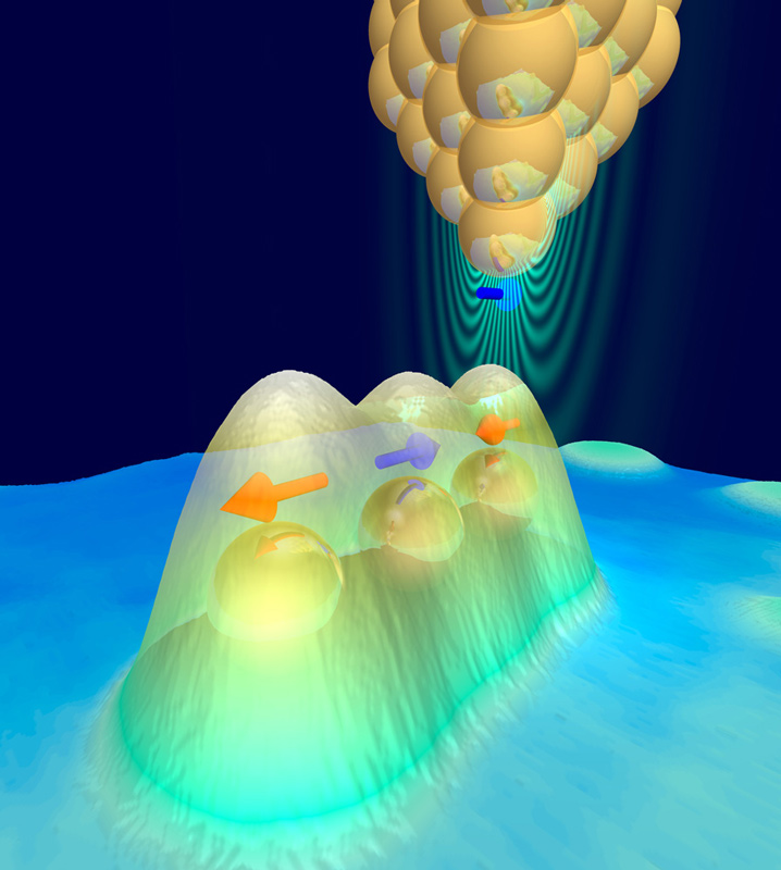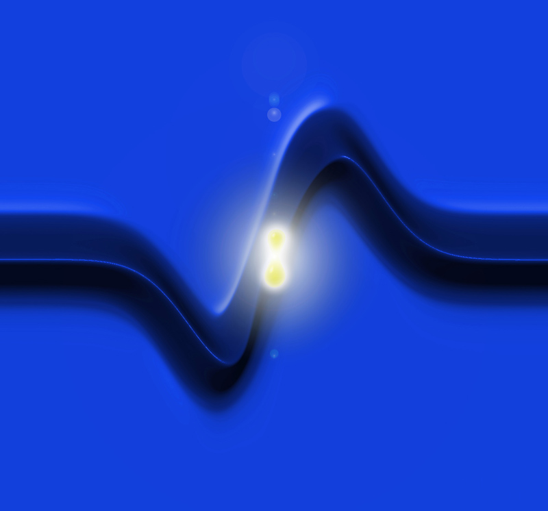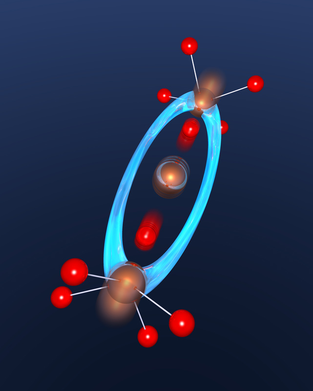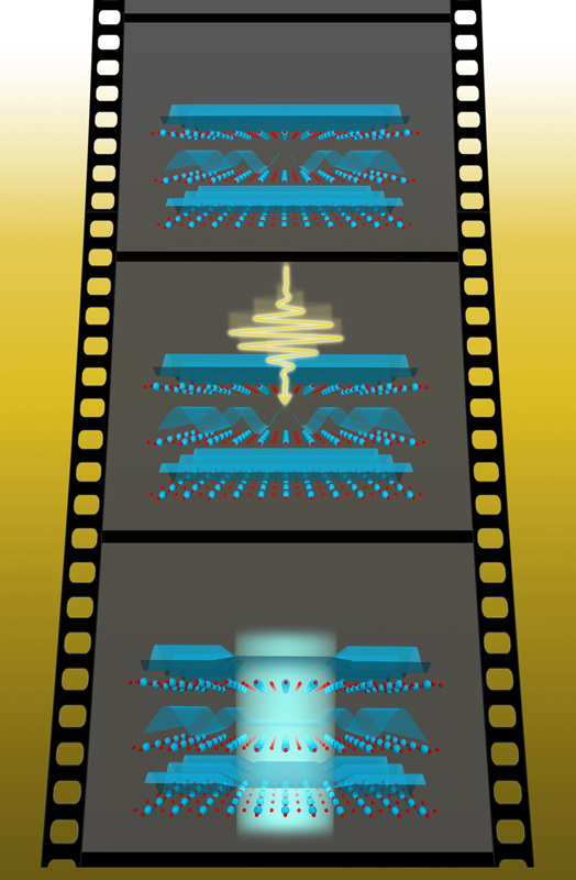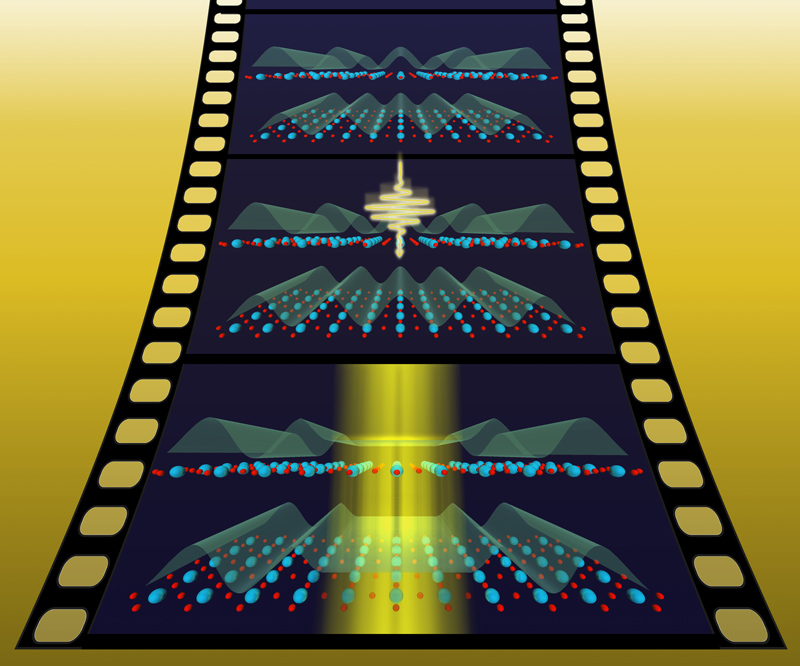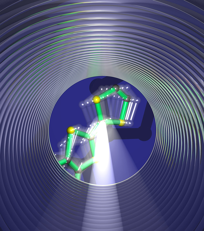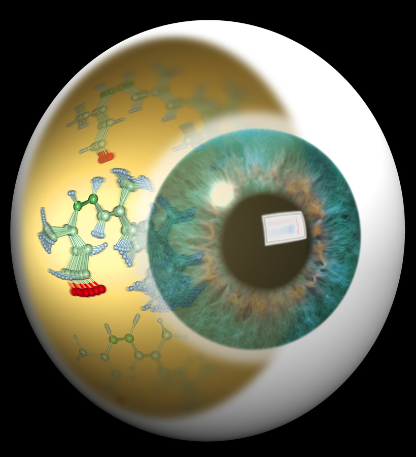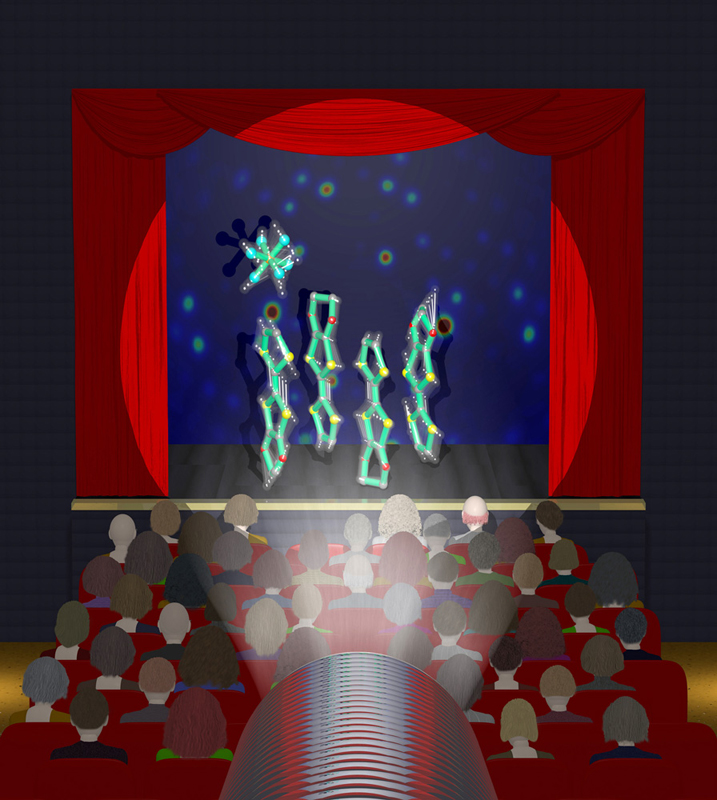 Die Ladungsdichte eines Elektrons (in blau) verändert sich durch die Wechselwirkung mit Photonen (in rot). Künstl. Umsetzung von theoretischen Ergebnissen.Künstlerische Darstellung der molekularen Bewegung des Chromophors Retinal, welche das Sehen ermöglicht.