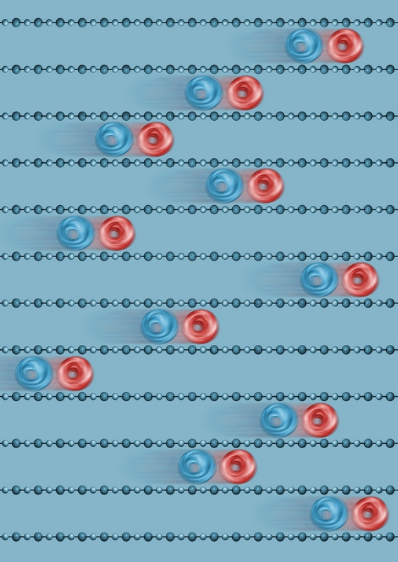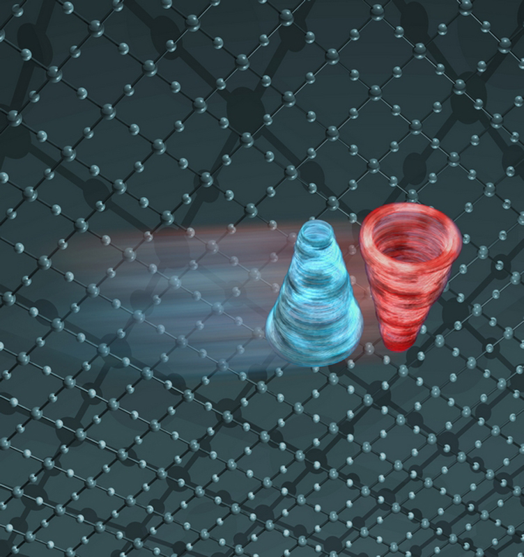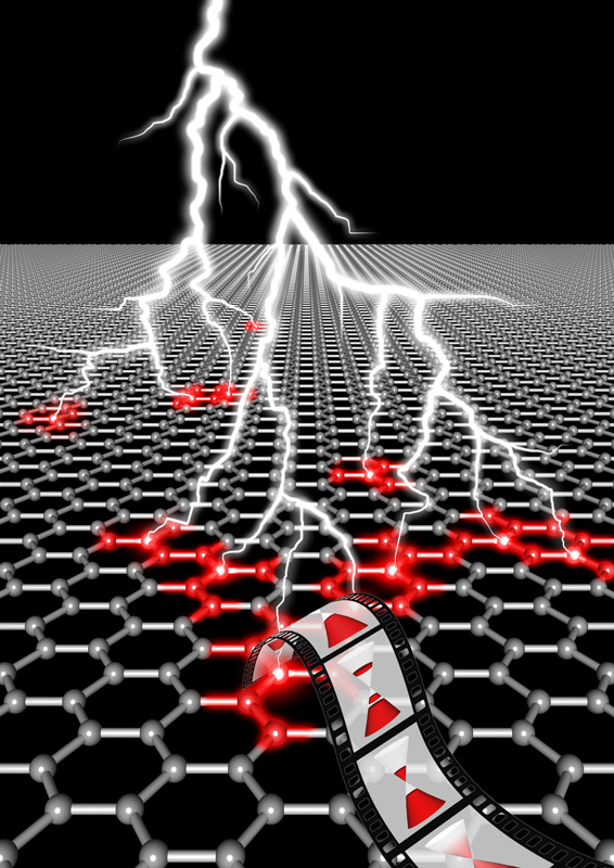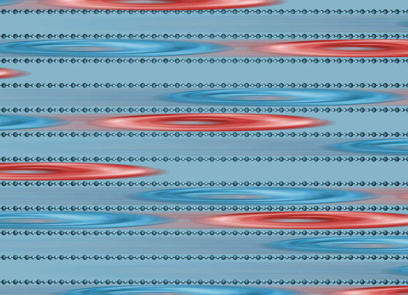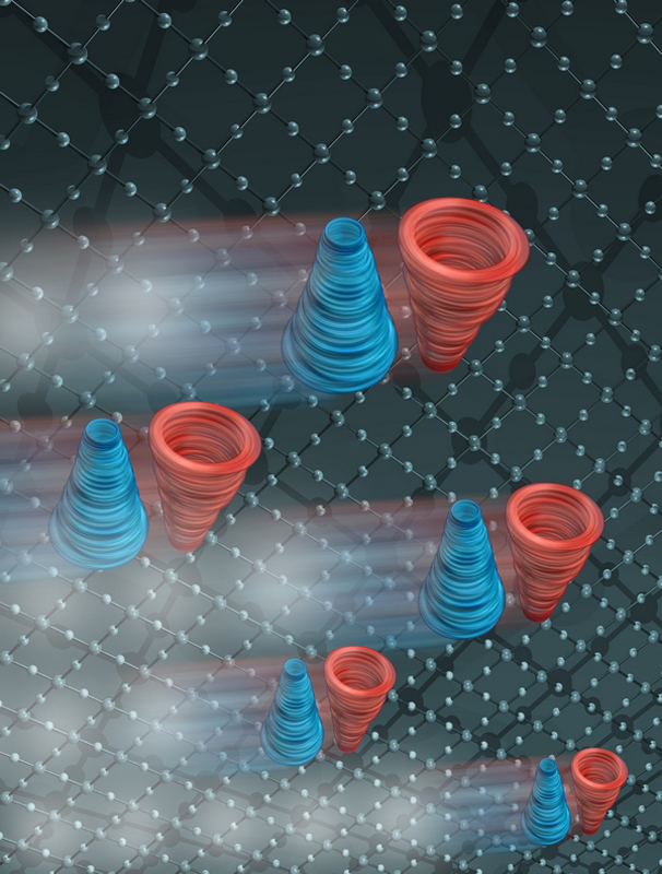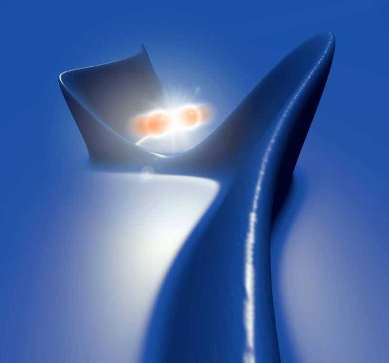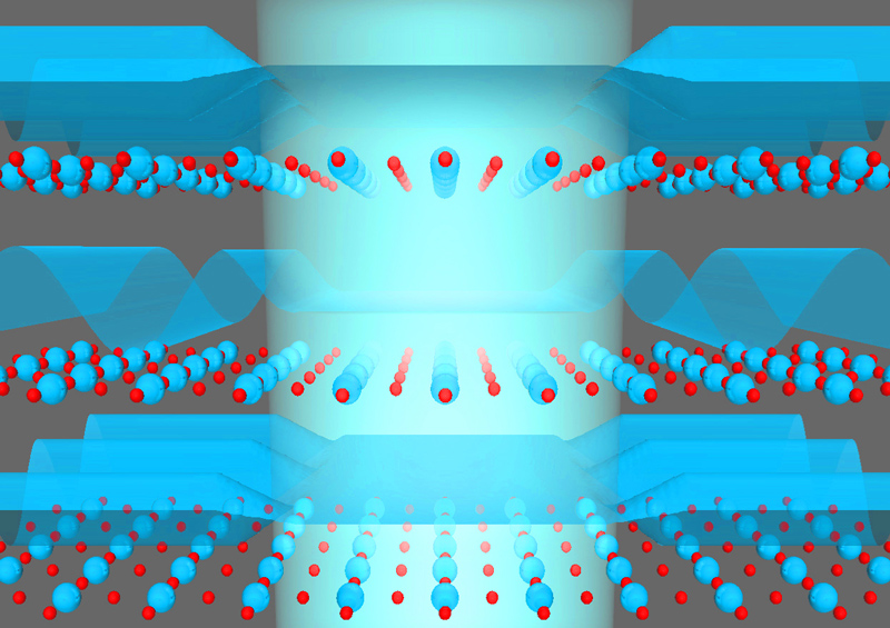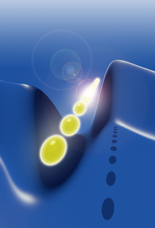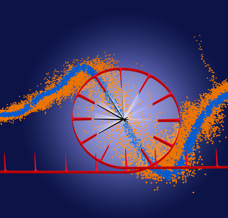 Die Ladungsdichte eines Elektrons (in blau) verändert sich durch die Wechselwirkung mit Photonen (in rot). Künstl. Umsetzung von theoretischen Ergebnissen.Künstlerische Darstellung der molekularen Bewegung des Chromophors Retinal, welche das Sehen ermöglicht.
